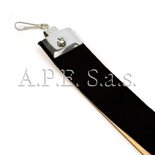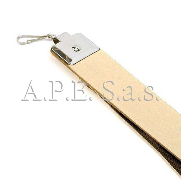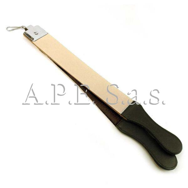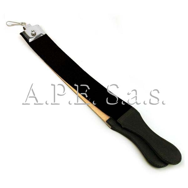 Striscia affila rasoio in cuoio, ad una estremità ha un moschettone girevole in metallo, per poterla appendere, mentre all'altra estremità ha una maniglia per poterla tenere in tensione.