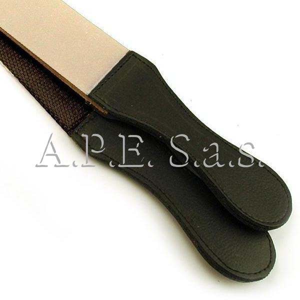 Il lato posteriore è costituito da una seconda striscia in similpelle e tessuto che può essere trattata successivamente per la lucidatura della lama stessa.